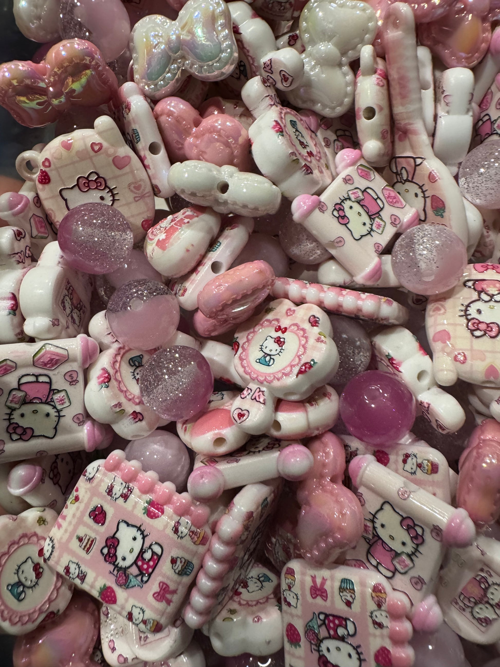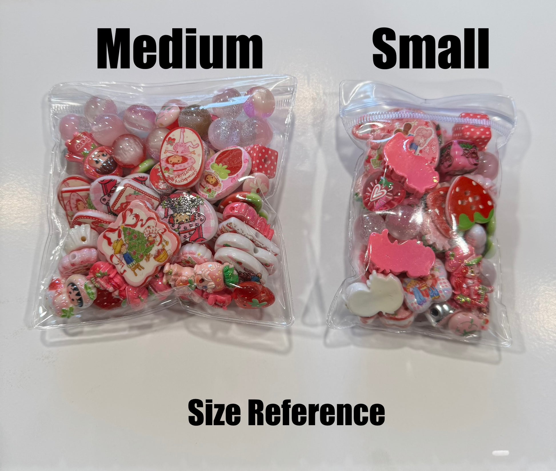all mixes have various sizes of bead they may include: various shapes, 16MM round beads, acrylic bead pillows, acrylic Bows, acrylic shapes.